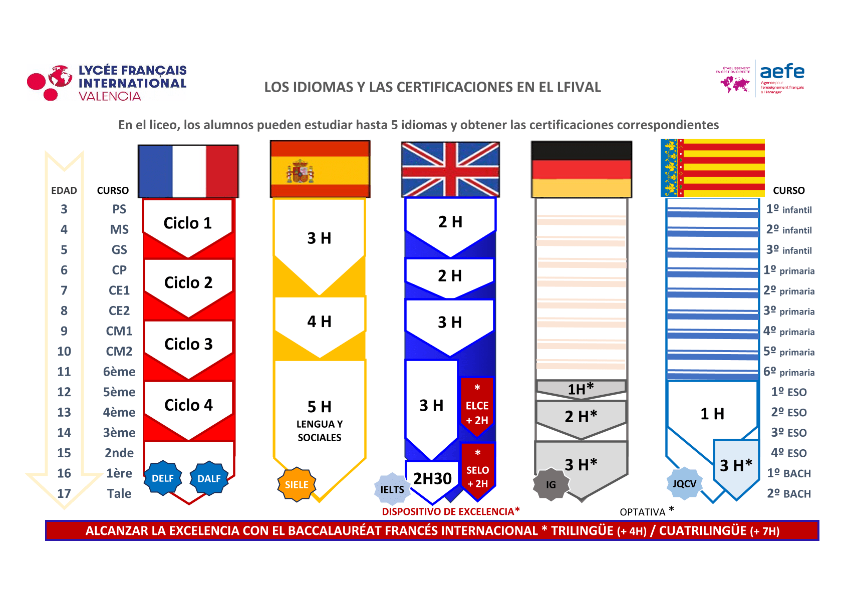 Este itinerario de excelencia se ofrecerá en modalidad trilingüe (francés, inglés, español) y cuatrilingüe (francés, inglés, alemán o francés, inglés, español, valenciano).